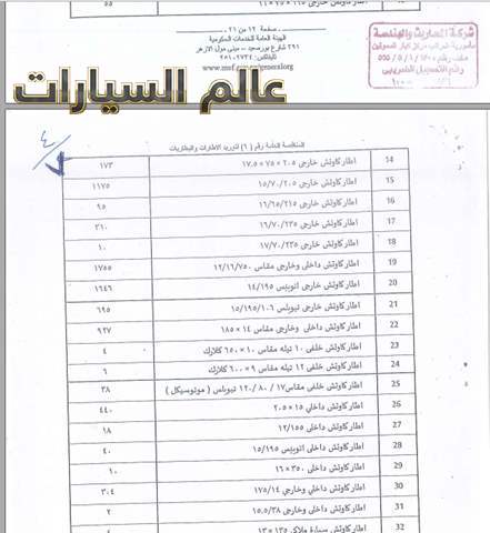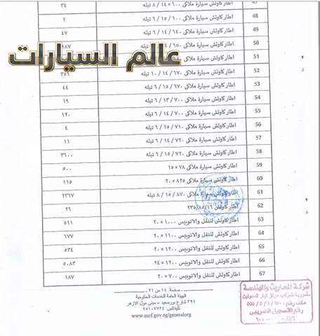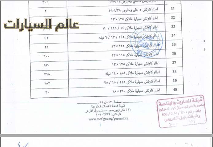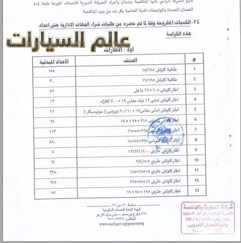 وتتضمن المناقصة توريد إطارات للسيارات الملاكي المملوكة للجهات الحكومية إضافة إلى الأتوبيسات المملوكة أيضا للجهات الحكومية كذالك توريد إطارات داخلية وخارجية للجرارات الزراعية والكراكات المملوكة للجهات التابعة لوزارة الزراعة .