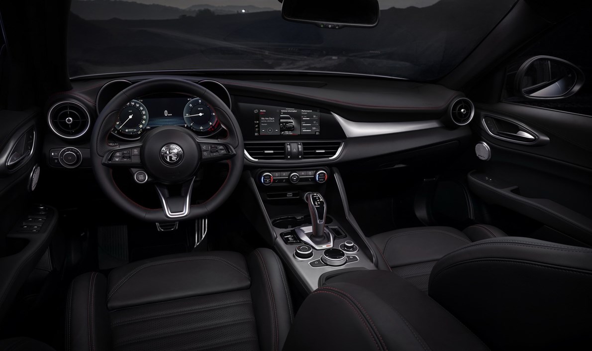 داخل المقصورة يظهر التشابه الأكبر مع "تونالي" حيث حصلت كل من "جوليا" و"ستيلفيو" على شاشة رقمية للعدادات مقاس 12.3 بوصة، ويمكن اختيار وضع Heritage في هذه الشاشة لتظهر الرسوم الجرافيك بها بنفس شكل عدادات "جوليا" في الستينيات، كما تتوفر اختيارات أخرى لأشكال الجرافيك العصرية مثل: Evolved و Relax.. ومن ضمن التقنيات الأخرى المستعارة من "تونالي" هي NFT وهي عبارة عن سجل رقمي لتاريخ السيارة منذ بدء تشغيلها، وهو غير قابل للتغيير بحيث يعزز من ثقة من لديه الرغبة في شراء السيارة مستعملة.