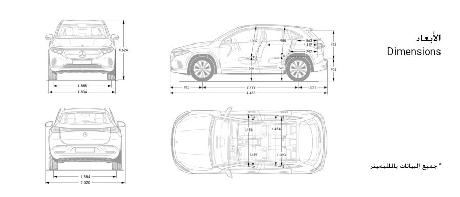 | الأبعاد الخارجية والسعة لـ "مرسيدس EQA" الكهربائية | |