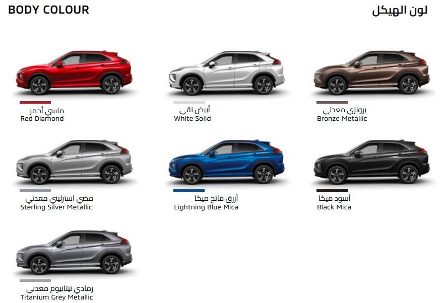تتوفر "إكليبس كروس" في 7 ألوان خارجية هم (الأبيض، الأسود، الرمادي، البرونزي، الفضي، الأزرق، الأحمر)، وتأتي المصدات الأمامية والخلفية مع الشبكة الأمامية وألواح الحماية في (لون أسود) للفئة الأولى أو مزيج من اللونين (الأسود والفضي) للفئتين الثانية والثالثة، أو في (لون السيارة الأساسي مع الأسود اللامع) في الفئة الرابعة.
