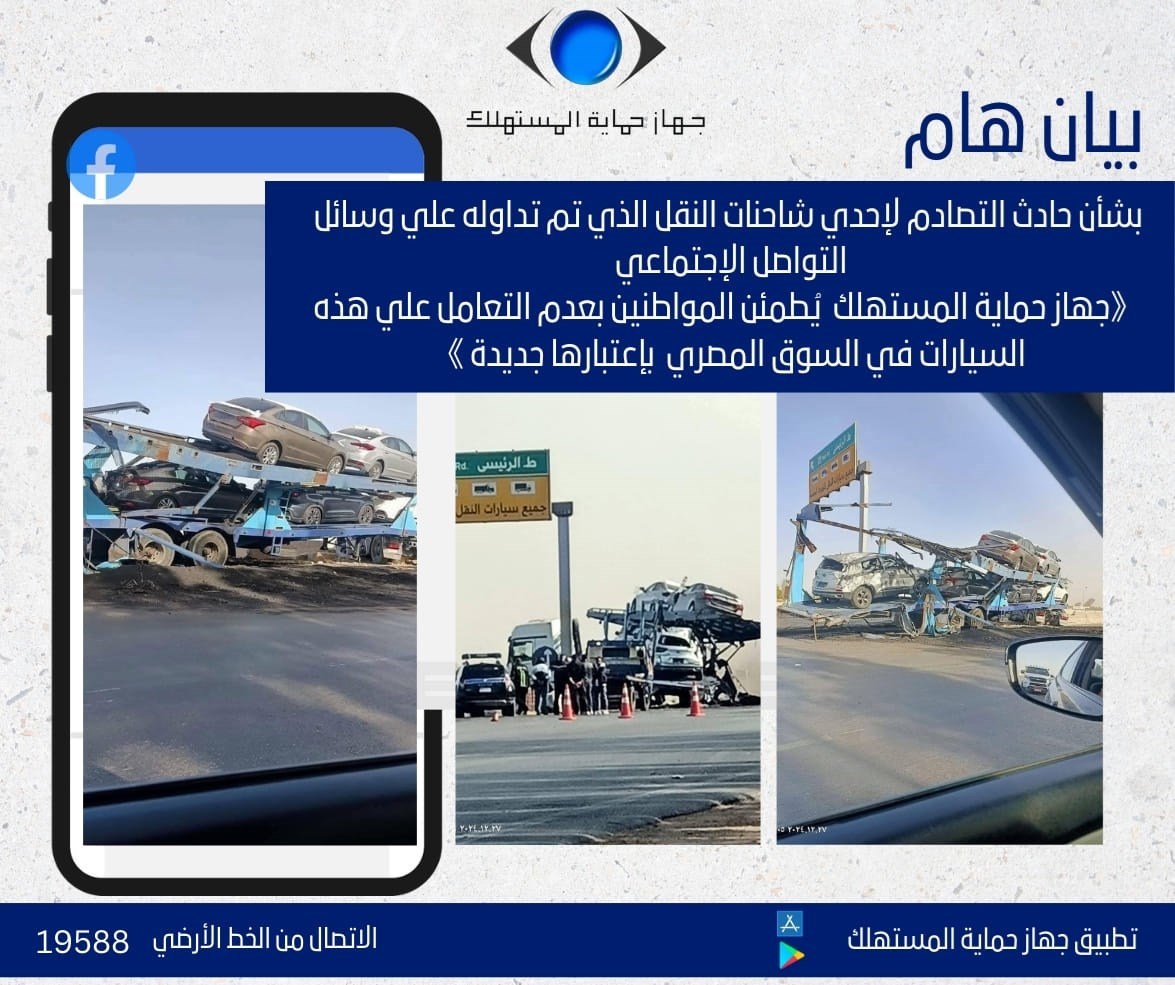 وأوضح جهاز حماية المستهلك في بيانه، أنه في ضوء ما تم رصده ومُتابعته علي وسائل التواصل الإجتماعي خلال الأيام الماضية، بشأن حادث التصادم الواقع بالطريق الصحراوي أمام مزارع الريف الأوروبي، لإحدي شاحنات النقل المُحملة بسيارات جديدة من طرازات شيري وهيونداي، التابعة للعلامة التجارية للوكيل فقد تم محاطبة الشركة للإفادة عن الحادث وموقف السيارات التالفة جراء هذه الواقعة، وإمدادها بكافة البيانات المُتعلقة بالسيارات محل الحادث.