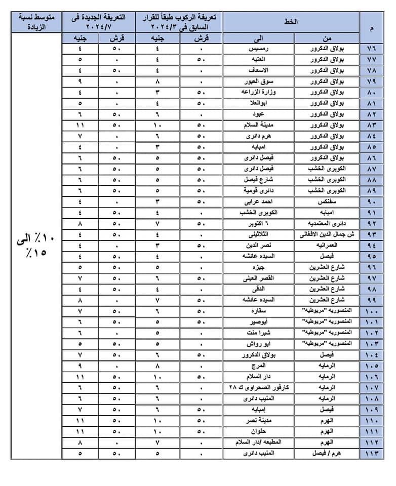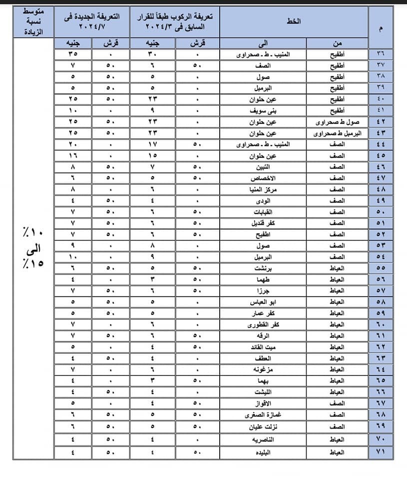 وأوضح النجار، أن اللجنة التي تم تشكيلها لتعديل تعريفة الركوب وضعت في اعتبارها مسافة كل خط سير وعدد الرحلات تحقيقًا للعدالة، مشيرًا إلى أن اللجنة استقرت على زيادة تعريفة تحديد أجرة السرفيس والمركبات طبقًا للزيادة الجديدة بمعدل يتراوح ما بين ١٠ الي 15 %.
