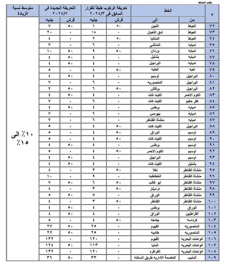 اعتمد المهندس عادل النجار، محافظ الجيزة، التعريفة الجديدة لسيارات السرفيس والنقل الجماعي الداخلية والخارجية، والتي يتم تطبيقها اعتبارًا من اليوم الخميس وطبقًا للجداول المرفقة، وذلك في ضوء قرار لجنة التسعير التلقائي للمنتجات البترولية بوزارة البترول بتحريك أسعار المنتجات البترولية.