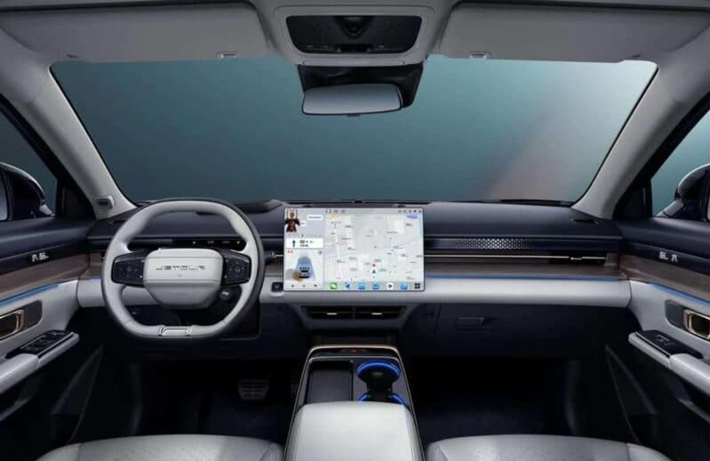 بالنسبة للمقصورة الداخلية فتحتوي على شاشة تحكم مقاسها 15.6 بوصة تستقر في منتصف لوحة القيادة وتدعم أحدث التطبيقات والبرامج، كما تأتي شاشة أخرى LCD مقاس 8 بوصة، وكذلك شاشة عرض رأسي HUD، مع عجلة قيادة بقاعدة مسطحة، نظام التعرف الصوتي، منصة شحن لاسلكي للهاتف، والمستوى الثاني من القيادة الذاتية أنظمة مساعدة السائق مثل مثبت السرعة وتغيير الحارة المرورية، وفتحة سقف.