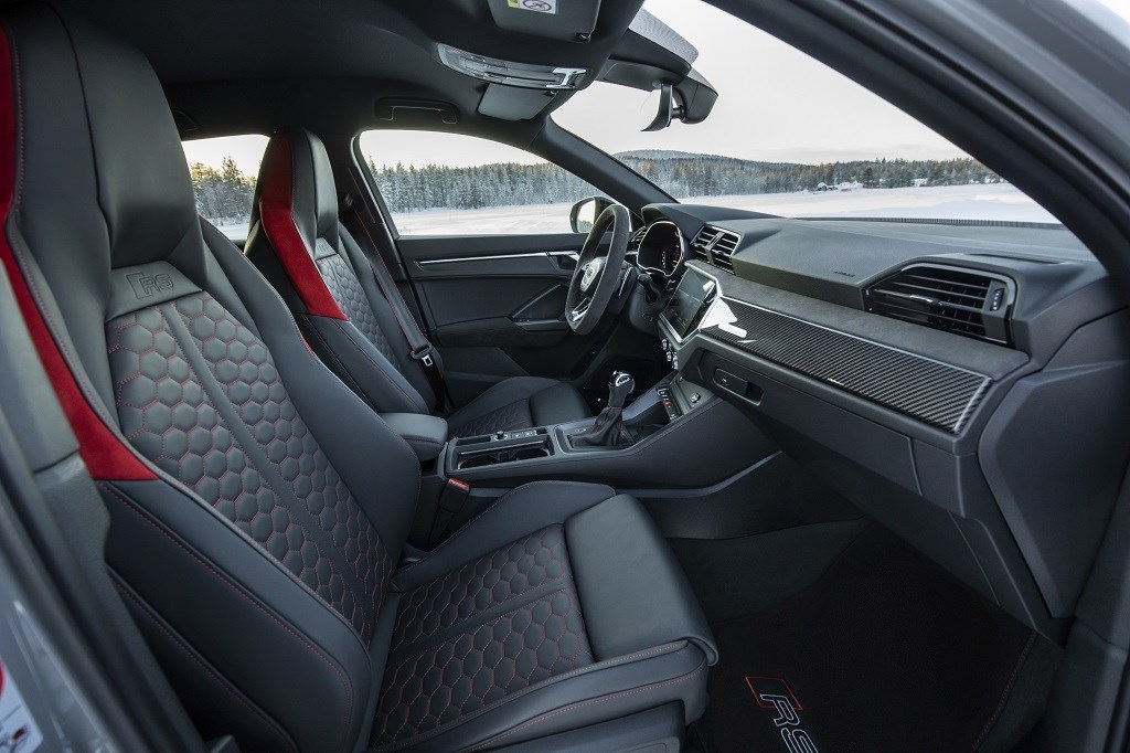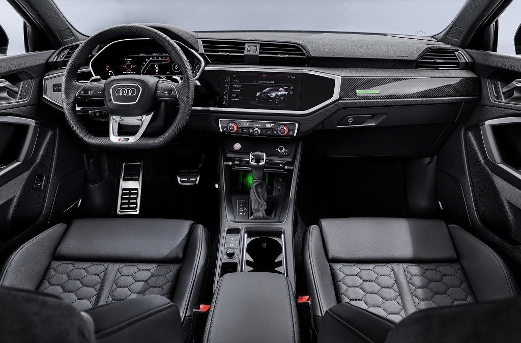وتتّسع مقصورة "RS Q3  سبورت باك" لجلوس خمسة ركّاب، وتأتي المقاعد الرياضية فئة "بلاس" مكسوَّة بجلد "نابا" الفاخر مع تطريزات بخياطة على شكل "خلية نحل"، ويُمكن ضبط المقاعد الأمامية كهربائيًّا في أكثرَ مِن اتِّجاه كما أنها مدعمة بخاصية الذاكرة ودعامة للفقرات القطنية بتحكُّم كهربائي في ٤ اتِّجاهات.. وتحتوي لوحة القيادة على شاشة مقاس ١٢.٣ بوصة للعدَّادات الرقمية (Audi Virtual Cockpit Plus)، وأخرى مقاس ١٠.١ بوصة مثبَّتة في المنتصف.