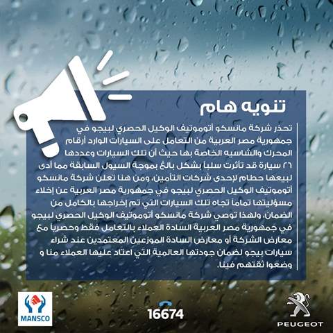 حذرت شركو مانسكو أوتوموتيف، الوكيل الحصري للعلامة التجارية بيجو في مصر، عملاءها من وجود عدد من سيارات بيجو في السوق المصري بيعت حطام، ولا تخضع للضمان.