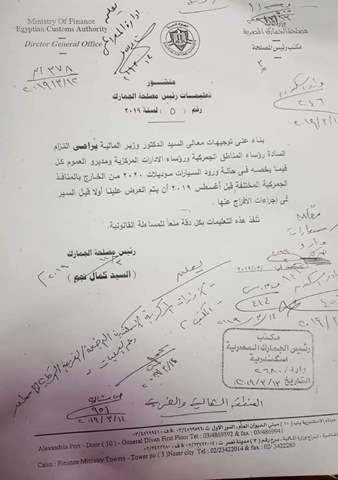 وذكر المنشور الذى يحمل رقم 5 لعام 2019 تحت عنوان "تعليمات رئيس مصلجة الجمارك" أنه بناءاً على توجيهات السيد وزير المالية، يراعي الأتزام السادة رؤساء المنافذ الجمركية ورؤساء الإدارات المركزية ومديرو العموم كل فيما يخصه فى حالة ورود ورود السيارات موديلات 2020 من الخارج بالمنافذ الجمركية المختلفة قبل أغسطس 2019 أن يتم العرض على رئيس مصلحة الجمارك أولاً قبل السير فى إجراءات الإفراج عنها.