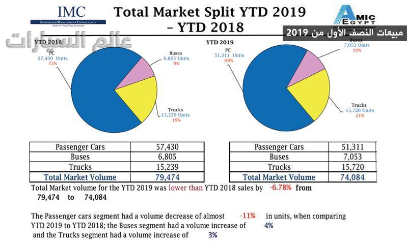 أما فيما يتعلق بالمبيعات الكلية للنصف الأول من 2019 مقارنة بالنصف الأول من عام 2018, نجد أن مبيعات 2019 لتلك الفترة وصلت إلى 74,084 وحدة مقابل 79,474 وحدة في 2018 بفارق سلبي 5,390 وحدة يمثل نسبة 6,78%.