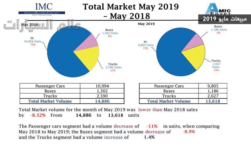 أما فيما يتعلق بالمبيعات بالقطاعات المختلفة للنصف الأول من 2019 مقارنة بالنصف الأول من عام 2018, نجد أن قطاع سيارات الركوب هو الأكثر تضرراً حيث كانت مبيعات 2019 لتلك الفترة 51,311 وحدة مقابل 57,340 وحدة في 2018 بفارق سلبي 6,119 وحدة يمثل نسبة 11%. كما نجد أن قطاع سيارات النقل الجماعي هو الأقل تضرراً حيث كانت مبيعات 2019 لتلك الفترة 7,053 وحدة مقابل 6,805 وحدة في 2018 بفارق إيجابي 248 وحدة يمثل نسبة 4%. وبالنظر إلى أن قطاع سيارات نقل البضائع حصل على زيادة أيضاً بنسبة 3%, تكون المشكلة بقطاع سيارات الركوب وحده.