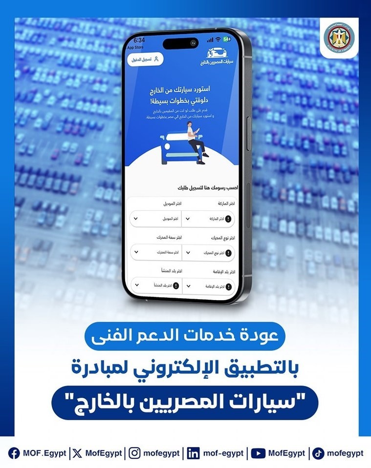 أكدت وزارة المالية على عودة خدمات الدعم الفنى الخاصة بالتطبيق الإلكتروني لمبادرة تيسير استيراد سيارات المصريين بالخارج، مشددة على الدعم الكامل لهذه المبادرة والالتزام بشروطها، وأنه قد تم إجراء بعض التحديثات بعد حدوث عطل فني.
