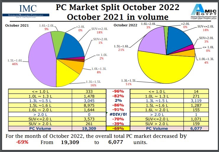 الجدير بالذكر أن مبيعات سيارات الركوب (الملاكي) في السوق المصري، سجلت إنخفاضا بنسبة 29% خلال الشهور العشرة الأولى من العام الجاري 2022، حيث بلغت إجمالي المبيعات 123,124 سيارة مقارنة بـ 173,176 سيارة مسجلة خلال نفس الفترة من العام الماضي 2021.