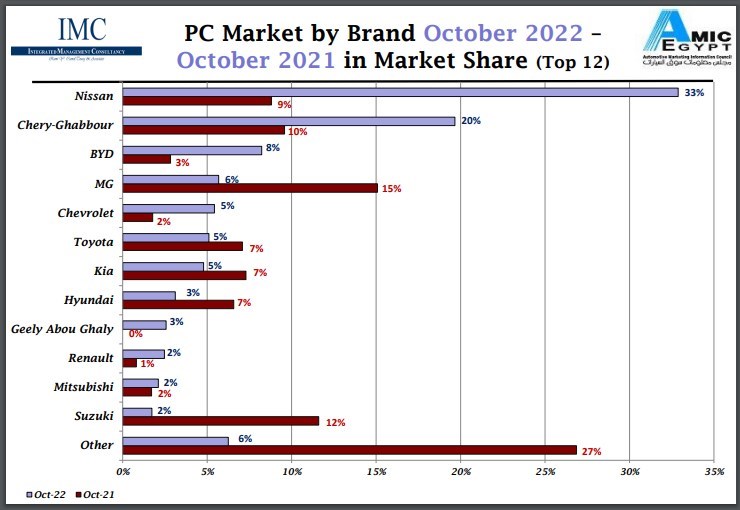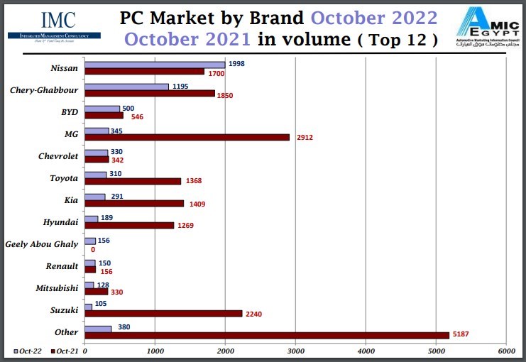 ووفقا للتقرير الصادر عن مجلس معلومات سوق السيارات "أميك-AMIC" تصدرت العلامة اليابانية "نيسان" قائمة السيارات الملاكي الأكثر مبيعا في مصر خلال أكتوبر 2022، حيث سجلت 1,998 سيارة بنسبة 33%، وذلك يعني ارتفاعا مقابل نفس الشهر العام الماضي والتي سجلت خلاله 1,700 سيارة بنسبة 9% فقط.