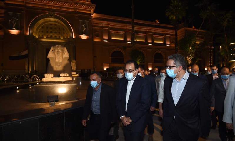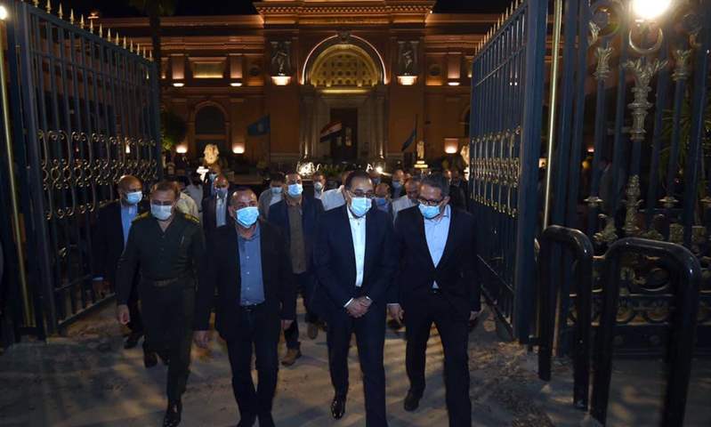 واستهل رئيس الوزراء جولته، بتفقد اعمال التطوير التى شهدها المتحف المصرى بالتحرير، والتى تضمنت رفع كفاءة الحديقة والنافورة المقامة بمقدمة المتحف، وكذا أعمال الاضاءة التى تم تنفيذها لواجهات المتحف، وشملت أسواره الخارجية والحديقة الخاصة به، وتمت الإشارة إلى أن تلك الاعمال تمت بالتعاون مع وزارة قطاع الاعمال العام.