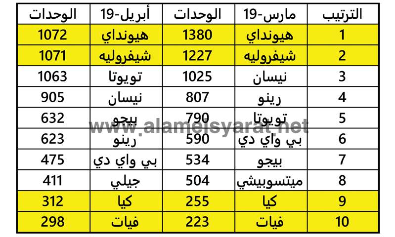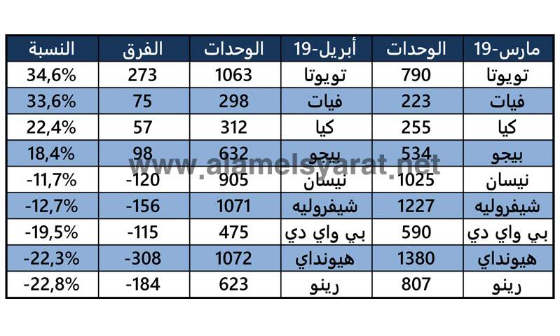 وكانت "تويوتا" الأوفر حظاً في الصعود حيث زاد حجم مبيعاتها بعدد 273 وحدة تمثل نسبة 34,6% بما أدخلها ضمن الثلاثة الكبار لشهر أبريل ثم تبعتها "فيات" بعدد 75 وحدة إضافية تمثل نسبة 33,6% ثم تبعتهما "كيا" بعدد 57 وحدة إضافية تمثل نسبة 22,4%. وكانت "رينو" الأعثر حظاً في الهبوط حيث قلت مبيعاتها بعدد 184 وحدة تمثل نسبة -22,8% ثم تبعتها "هيونداي" بخسارتها لـ308 وحدة تمثل نسبة -22,3% ثم تبعتهما "بي واي دي" بخسارتها لـ115 وحدة تمثل نسبة -19,5%.
