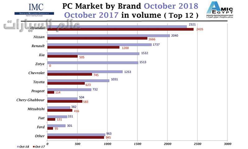 أوضح أحدث تقرير لمجلس معلومات سوق السيارات (أميك) لشهر نوفمبر 2018 ترتيب مراكز شركات السيارات فيما يتعلق بقطاع سيارات الركوب محليا في مصر, وهو ترتيب يؤكد اختراق "رينو" للصفوف الأولى بقوة وظهور أوضح لـ"أوبل" وصعود لـ"فيات" مقارنة بمراكز ومبيعات شهر أكتوبر 2018.
