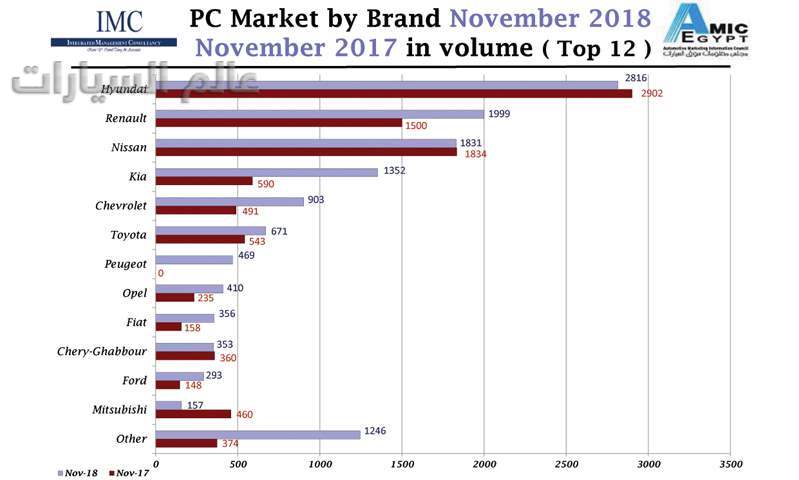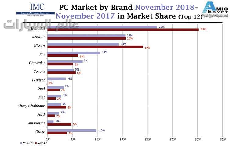 وكان المركز الأول –كالعادة- لشركة "هيونداي" التي أستطاعت أن تبيع 2816 وحدة بحصة سوقية 22% مع زيادة بعدد 495 وحدة. وقد نجحت "رينو" أن تضع نفسها في المركز الثاني على التوالي لتصعد من المركز الثالث مبدلة مكانها بـ"نيسان" –التي لا تسهل منافستها- وقد باعت الشركة 1999 وحدة بحصة سوقية 16% مع زيادة بعدد 262 وحدة. أما "نيسان" فقد قلت مبيعاتها بـ209 وحدة حيث باعت خلال نوفمبر 1831 وحدة تمثل حصة سوقية 14%.
