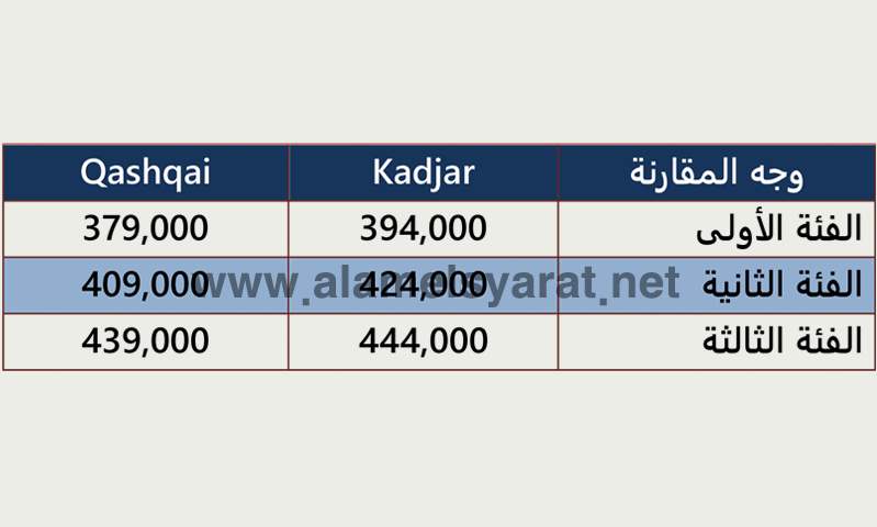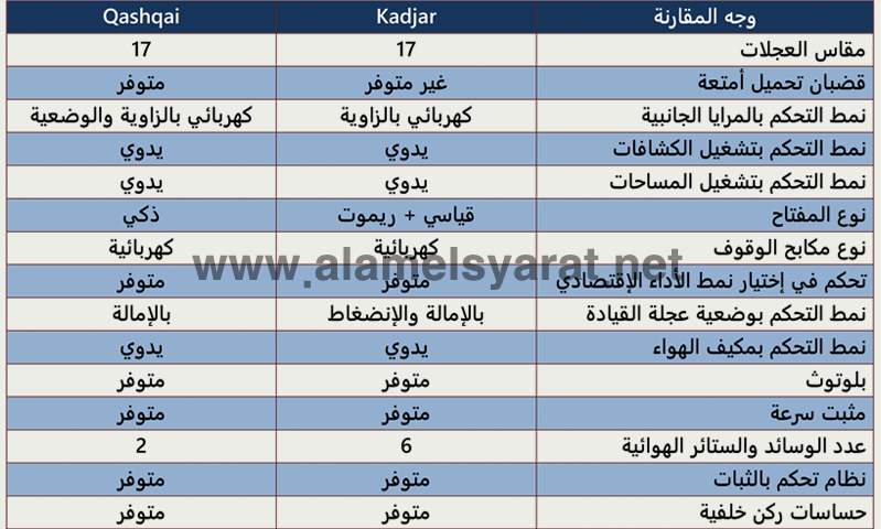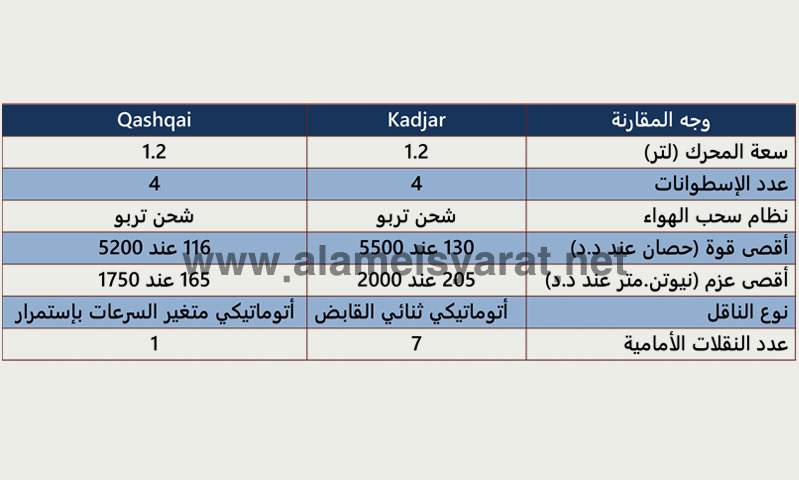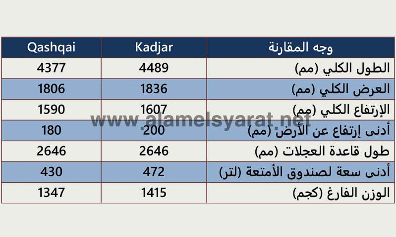 ومن هنا يتضح أن "Kadjar" بشكلها الجديد تستمر في التفوق على "Qashqai" في كافة البنود الأساسية المتعلقة بالقياسات والأوزان ما عدا طول قاعدة العجلات.