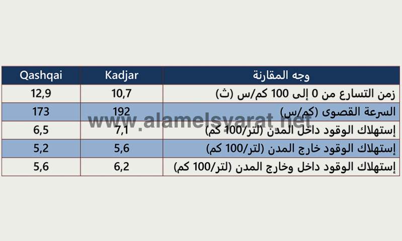 ومن هنا يتضح أن كلا من "Kadjar" بشكلها الجديد و"Qashqai" تتميزان بالإستهلاك المنخفض للوقود, وهو لصالح "Qashqai" بطبيعة اختلاف قوة المحرك وهو ما يجعل أرقام أداءها أقل أمام "Kadjar" من حيث التسارع والسرعة القصوى.