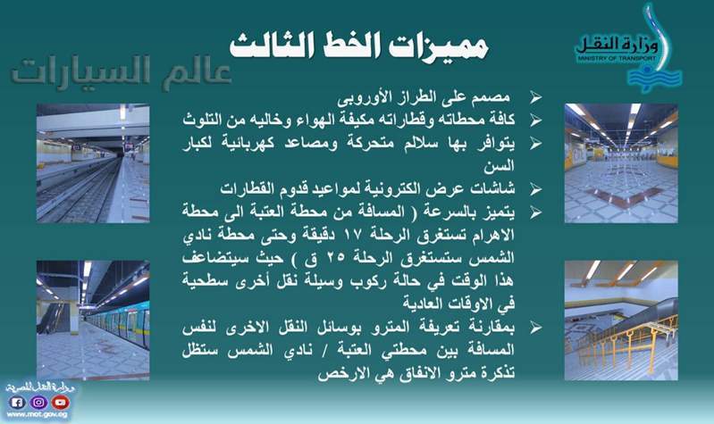 وأشارت الوزارة في بيانها ان الخط الثالث بالكامل مصمم على الطراز الأوروبى وكافة محطاته وقطاراته مكيفة الهواء وخالية من التلوث ويتوافر بها سلالم متحركة ومصاعد كهربائية لكبار السن وشاشات عرض الكترونية لمواعيد قدوم القطارات وان خدمة المترو تتميز بالسرعة ( المسافة من محطة العتبة الى محطة الاهرام تستغرق الرحلة 17 دقيقة وحتى محطة نادي الشمس ستستغرق الرحلة 25 ق ) حيث سيتضاعف هذا الوقت في حالة ركوب وسيلة نقل أخرى سطحية في الاوقات العادية كما أنه بمقارنة تعريفة المترو بوسائل النقل الاخرى لنفس المسافة بين محطتي العتبة / نادي الشمس ستظل تذكرة مترو الانفاق هي الارخص .