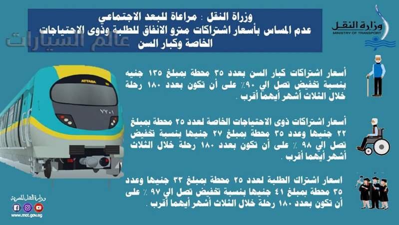 وأنه مراعاة للبعد الاجتماعي تم عدم المساس بأسعار اشتراكات الطلبة وذوى الاحتياجات الخاصة وكبار السن (بحيث أن اشتراك الطلبة لعدد 25 محطة بمبلغ 33 جنيها وعدد 35 محطة بمبلغ 41 جنيها بنسبة تخفيض تصل 97%، وأسعار اشتراكات ذوى الاحتياجات الخاصة لعدد 25 محطة بمبلغ 22 جنيها ، وعدد 35 محطة بمبلغ 27 جنيها بنسبة تخفيض تصل 98 % ، وأسعار اشتراكات كبار السن بعدد 35 محطة بمبلغ 135 جنيه بنسبة تخفيض تصل 90 %، ) على أن تكون بعدد 180 رحلة خلال الثلاث أشهر أيهما أقرب .