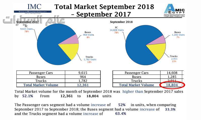 وبنهاية أكتوبر 2018, وصل مجموع مبيعات سيارات السوق المصري للعام الحالي منذ بداية يناير حتى نهاية أكتوبر إلى 150,016 وحدة منها 71,535 وحدة للسيارات المجمعة محلياً و78,481 وحدة للسيارات المستوردة. وذلك بزيادة بنسبة 18,5% للسيارات المجمعة محلياً و62,3% للسيارات المستوردة مقارنة بنفس الفترة من عام 2017 الماضي.