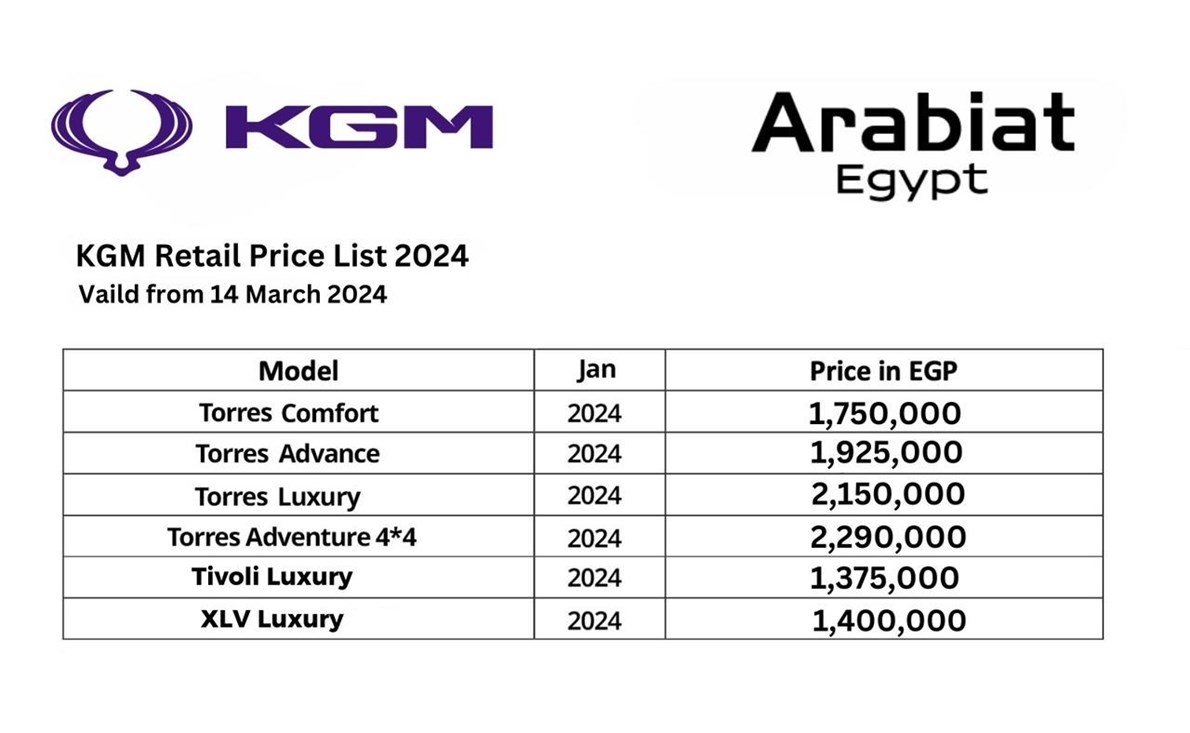 وتشمل التخفيضات - التي تبدأ من يوم 14 مارس 2024 - بشكل رئيسي سيارات KGM الكورية "توريس" و"تيفولي"، التي تتميز بتصميمها الأنيق والرياضي وبمواصفات تقنية عالية الجودة، مما يجعلها خيارًا مفضلًا لدى عشاق السيارات في مصر.