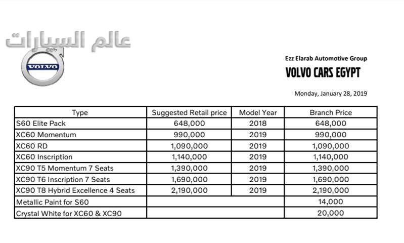 وقد حصلت " عالم السيارات " على نسخة من قائمة الأسعار الجديدة لسيارات فولفو فى مصر (موديلات 2019) وهى موضحة بالجدول التالى