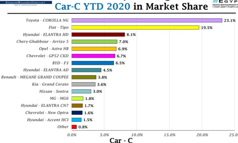 كشف تقرير مجلس معلومات سوق السيارات "أميك" الصادر عن شهر سبتمبر الماضي، عن حجم مبيعات السيارات السيدان "Car-C" خلال الـ9 أشهر الأولى من العام الجاري 2020، حيث تصدر قائمة الأكثر مبيعًا في تلك الفئة سيارة تويوتا كورولا بنسبة 23,1%، ما يُعادل 9812 وحدة، من إجمالي مبيعات فئتها الذي وصل إلى 42509 وحدة.