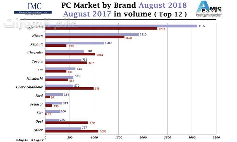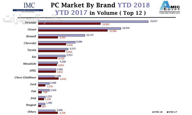 وتظل "هيونداي" على القمة بمبيعات 24017 وحدة, تليها "نيسان" بمبيعات 18019 وحدة, وبعدها "رينو" بمبيعات 10175 وحدة, ثم "شيفروليه" بمبيعات 8068 وحدة, ثم "تويوتا" بمبيعات 6523 وحدة, ثم "كيا" بمبيعات 5913 وحدة, ثم "ميتسوبيشي" بمبيعات 4268 وحدة, ثم "أوبل" بمبيعات 3881 وحدة, ثم "شيري" بمبيعات 3505 وحدة, وأخيراً "فورد" بمبيعات 2460 وحدة تبعاً لترتيب العشر الأوائل.