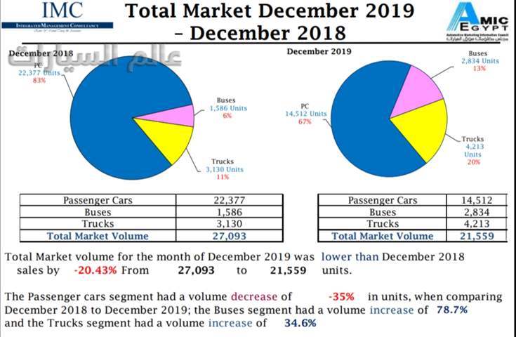 وحسب "أميك" ارتفعت نسبة مبيعات الأتوبيسات خلال ديسمبر 2019 حيث بلغت نسبتها 13% من إجمالي مبيعات السيارات وباعت 2,834 وحدة، مقارنة بالشهر نفسه من عام 2018 فبلغت نسبتها 6% ما يعادل 1,586 وحدة.