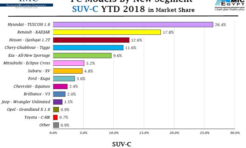 وضمن نفس الفئة التى قدرت مبيعاتها الأجمالية بنحو 10368 سيارة، جاءت رينو كادجار فى المركز الثاني برصيد 17,8% بنحو 1845سيارة فيما تقدمت نيسان قشقاى مركز واحد على حساب شيرى تيجو لتصعد الى المركز الثالث برصيد 12.6 % ببيع 1302 سيارة وربما يرجع النمو فى مبيعات قاشقاى الى حملة العروض التروجية التى قامت بها نيسان موتور ايجيبت خلال الشهور القليلة الماضية .