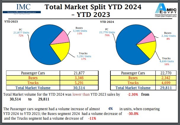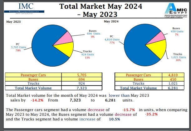 ووفقا للتقرير شهدت مبيعات السيارات الملاكي نموا بنسبة 4% خلال الأشهر الخمسة الأولى من 2024 بعد تسجيل 22,770 سيارة مقابل 21,877 سيارة تم تسجيلها خلال نفس الفترة العام الماضي.. وعلى النقيض تراجعت مبيعات الحافلات بنسبة 30 % من3,346 حافلة إلى 2,342 حافلة، وبالمثل انخفضت مبيعات الشاحنات والتي تراجعت من 5,291 شاحنة إلى 4,699 شاحنة بنسبة انخفاض تصل إلى 11 %.