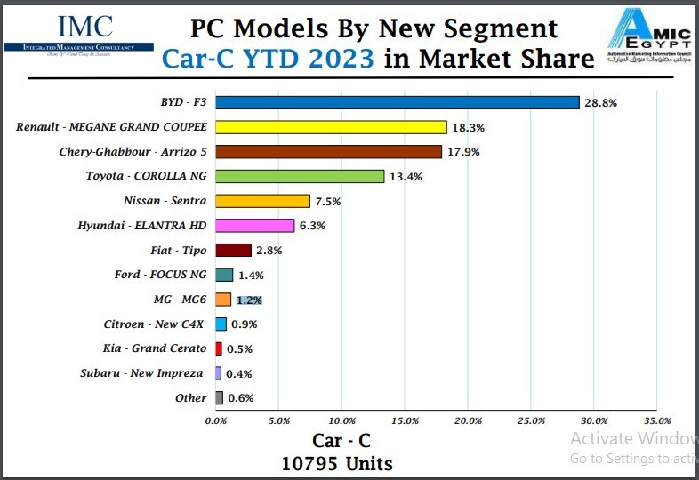 كشف التقرير الصادر عن مركز معلومات سوق السيارات "أميك" عن قائمة السيارات المدمجة Car-C الأكثر مبيعا في السوق المصري، خلال الفترة من يناير وحتى أغسطس من العام الجاري، والتي تربعت على عرشها السيارة "بي واي دي f3" بعدما سجلت 3,113 سيارة، مستحوذة على 28.8% من إجمالي مبيعات هذه الفئة البالغة 10,795 سيارة.