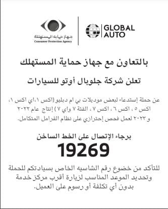 وناشدت "جلوبال أوتو" عملائها مالكي تلك الموديلات من الطرازات التي ذكرناها، التواصل مع الشركة المالكة للحجز المُسبق.