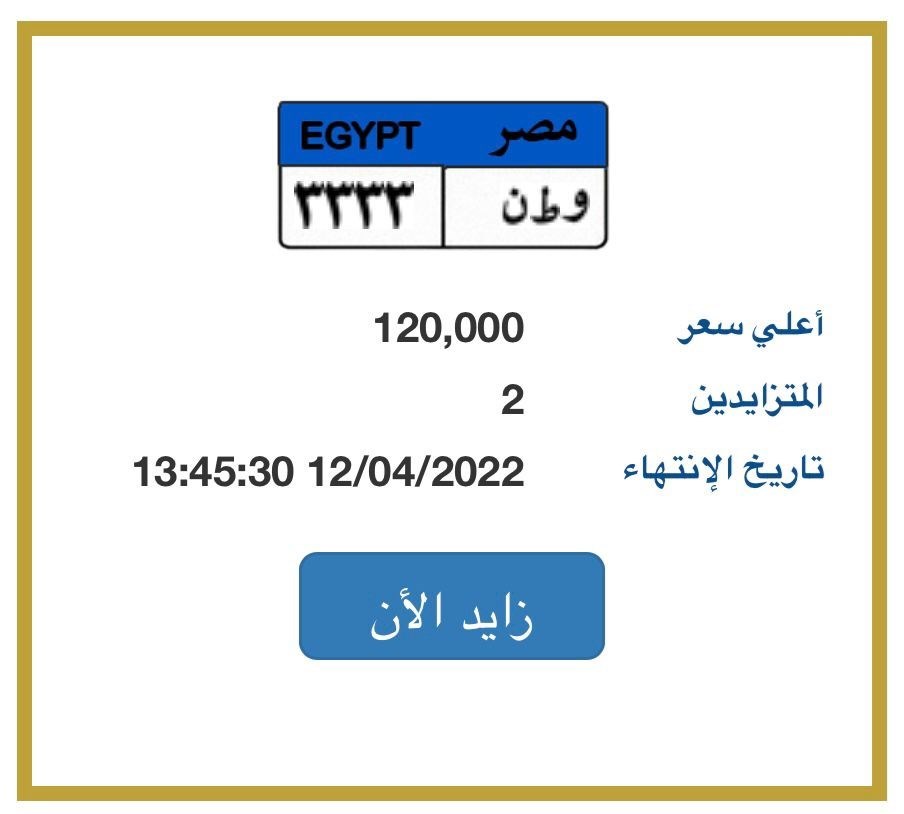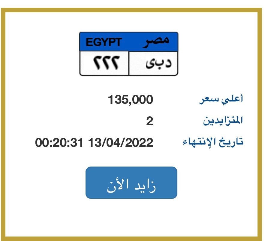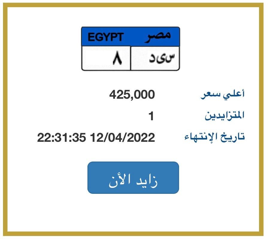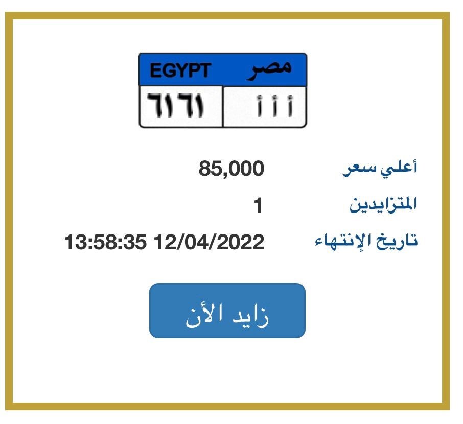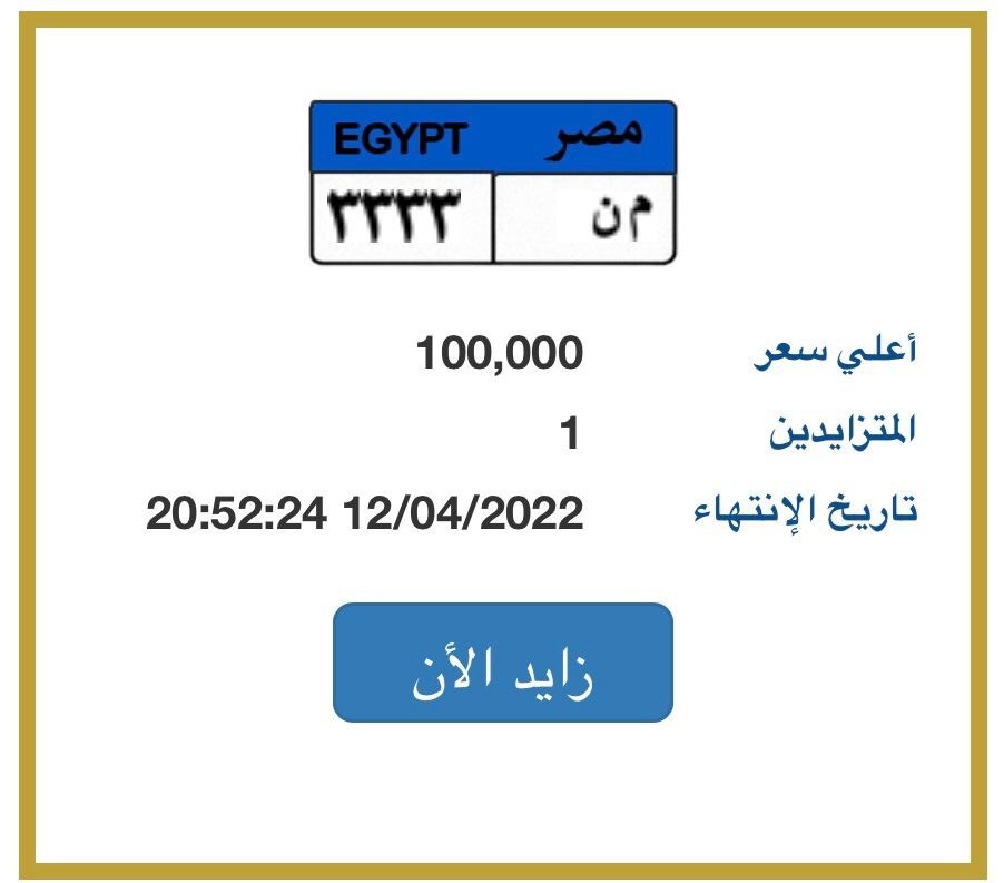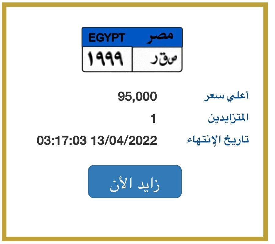 وطرح الموقع لوحات ينتهي تاريخ المزايدة عليها اليوم 10 إبريل 2022 وأخرى بتواريخ 12 و 13 إبريل الحالي..وتنتهي المزايدات في بعض اللوحات في حدود الساعة الـ 6 مساء اليوم وأخرى ممتدة حتى العاشرة مساء يوم الثلاثاء 12 إبريل.