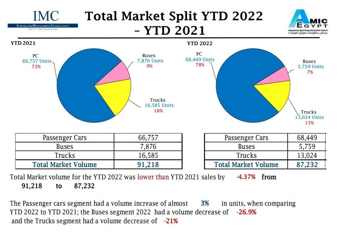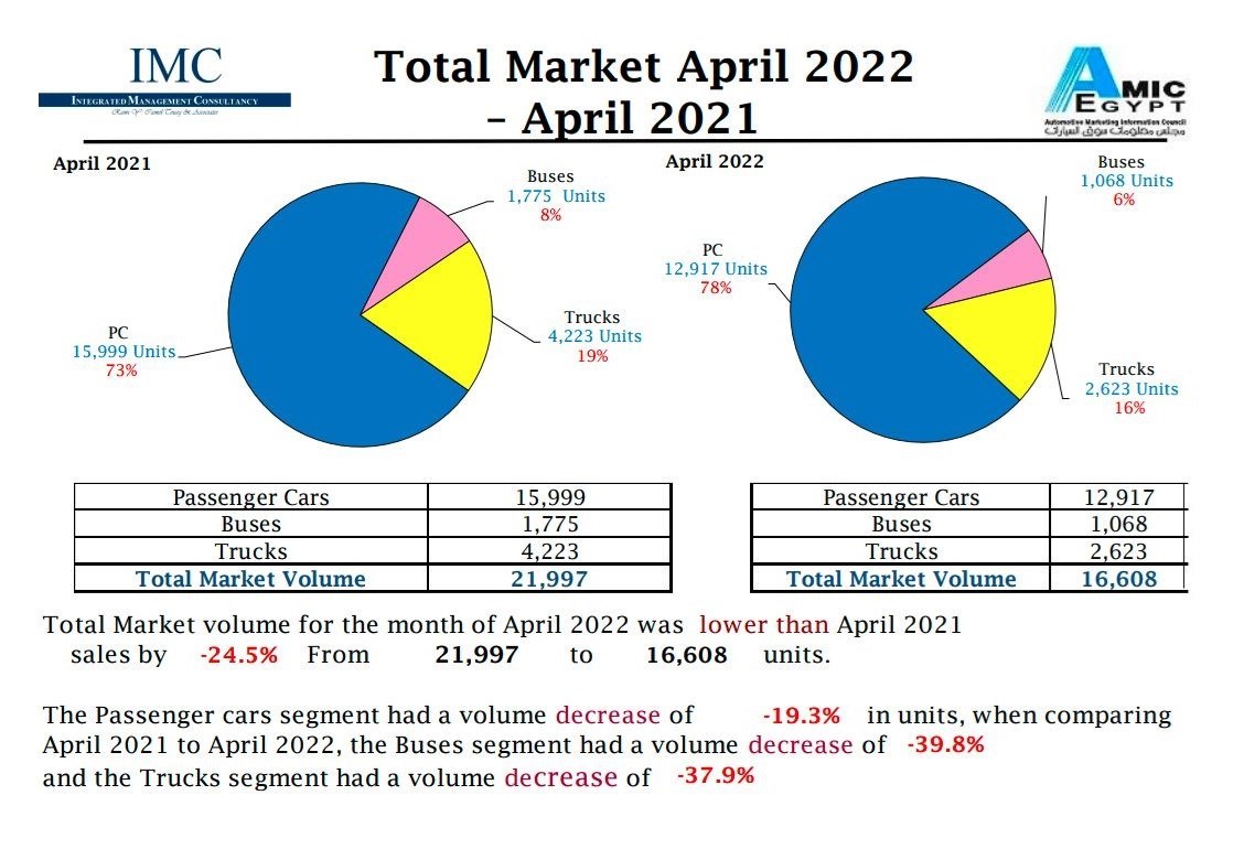 وبخصوص الفئات الثلاثة معًا (سيارات الركوب والحافلات والشاحنات) فتشير إلى الأرقام إلى انخفاض مبيعاتهم بنسبة 4.37% ما بين الشهور يناير وأبريل مقارنة بالعام الماضي، بعد أن كانت قد سجلت ارتفاعًا نسبته 2% خلال الربع الأول من 2022 بالمقارنة مع العام الماضي (وذلك قبل أحداث رفع سعر الدولار التي ظهرت تداعياتها بدءًا من شهر أبريل، ومتوقع أن يتواصل انخفاض المبيعات في الشهور اللاحقة).
