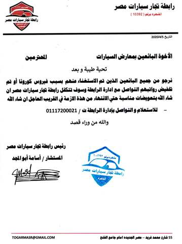 وعلى الرغم من تشديد المستشار أسامة أبو المجد، رئيس رابطة تجار السيارات، بأنه لم يتم تسريح أي موظف أو عامل من وظيفته بأي من معارض السيارات، وبأن الرابطة لم تتلق أي شكوى من عامل أو موظف بتسريحه أو تقليص مرتبه حتى الآن، إلا أنه أكد أن الرابطة ستتكفل بتغطية أي عجز في رواتب الموظفين والعمال بالمعارض والشركات حتى تمر هذه الأزمة، ودعا العمال الذين يفقدون وظيفتهم أو يتم تقليص رواتبهم للتواصل مع إدارة الرابطة لاتخاذ الإجراء اللازم، مشيراً إلى أنه لم تأتِ شكوى واحدة حتى الآن بتقليص رواتب أو تسريح عامل من عمله.