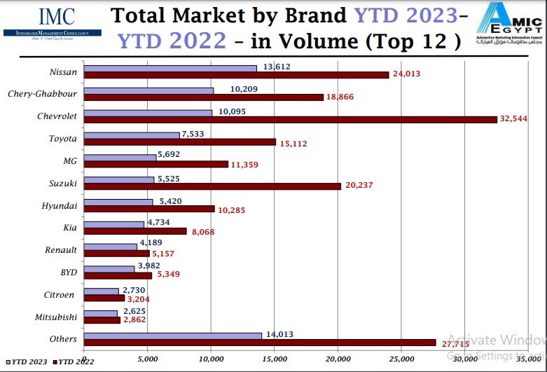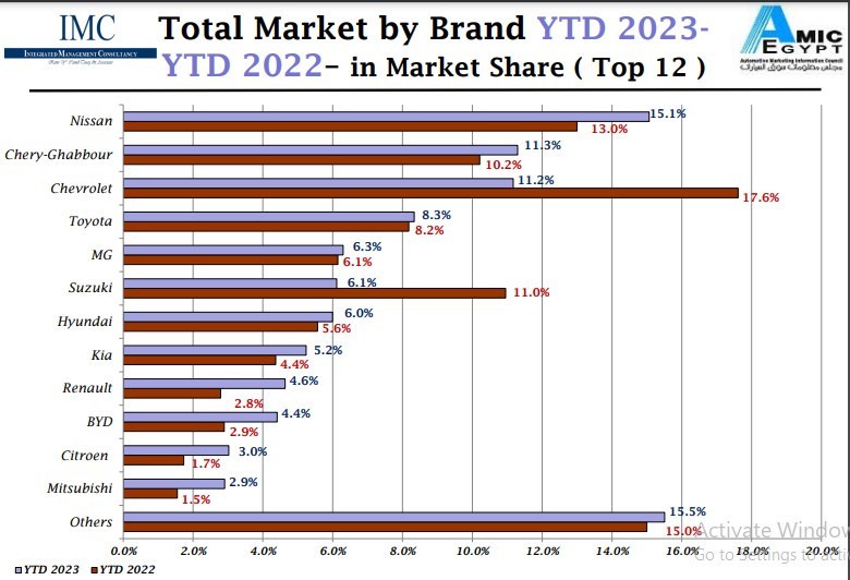 وتأتي العلامة الصينية " شيري Chery" في المرتبة الثانية بمبيعات نحو 10,209 سيارة، وحصة سوقية 11.3% مقابل 24,013 سيارة كانت قد سجلتها خلال عام 2022، فيما احتلت "شيفرولية Chevrolet" المرتبة الثالثة بإجمالي 10,095 سيارة مستحوذة على 11.2% من الحصة السوقية وهو تراجع حاد مقارنة بعام 2022 الذي سجلت خلاله نحو 32,544 سيارة.