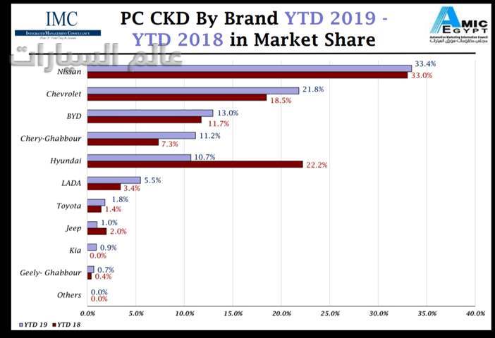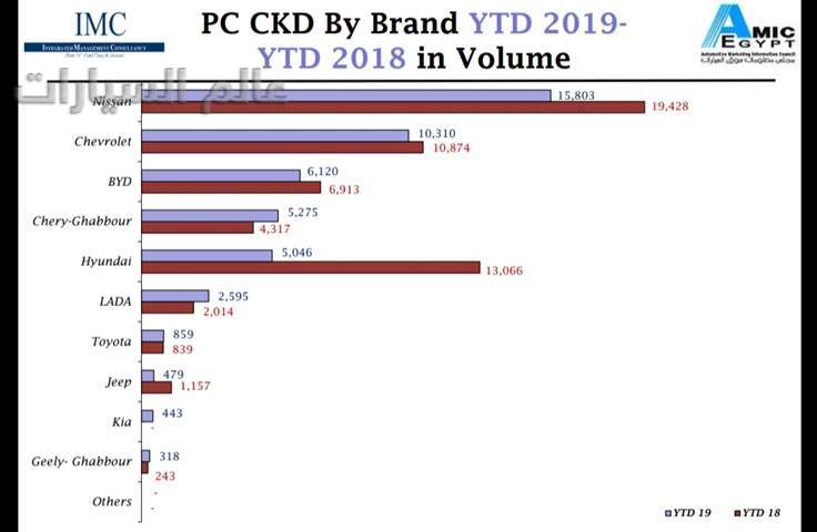 وحسب تقرير مجلس معلومات السيارات "أميك" الصادر عن مبيعات العام الماضي 2019، احتلت علامة "شيفرولية" المرتبة الثانية بنسبة 21,8% بعدد وحدات بلغ 10,310، تلتها في المرتبة الثالثة "بي واي دي" بنسبة 13 % ما يعادل 6,120 وحدة.