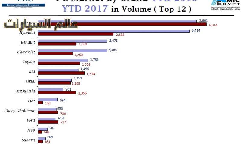 وجاءت فى المركز الثالث رينو بحصة سوقية بلغت 10.1% ببيع 7,272 سيارة مقابل 13,331 سيارة خلال نفس الفترة من عام 2017