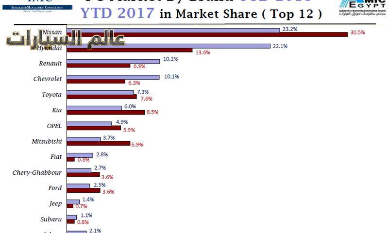 احتلت العلامات التجارية الثلاث " نيسان – هيونداى - رينو " صدارة مبيعات السيارات الملاكى فى مصر خلال الربع الأول من عام 2018 وطبقا لآخر تقرير صادر من مجلس معلومات سوق السيارات "أميك" فقد احتلت نيسان صدارة مبيعات الملاكى فى مصر بحصة سوقية بلغت 23.2% ببيع 5.661 سيارة منذ بداية يناير 2018 وحتى نهاية مارس الماضى رغم تراجع مبيعاتها مقارنة بنفس الفترة من عام 2017 والذي سجل بيع 6.014 سيارة وكانت تستحوذ على حصة سوقية بلغت 30.5%
