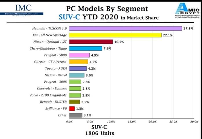 كشف تقرير مجلس معلومات سوق السيارات "أميك"، عن حجم مبيعات السيارات الـ"SUV-C" خلال شهر يناير الماضي والذي بلغ 1806، حيث استحوذت على المرتبة الأولى منهم سيارة "هيونداي توسان"بنسبة 27,1% ما يعادل 489 وحدة.