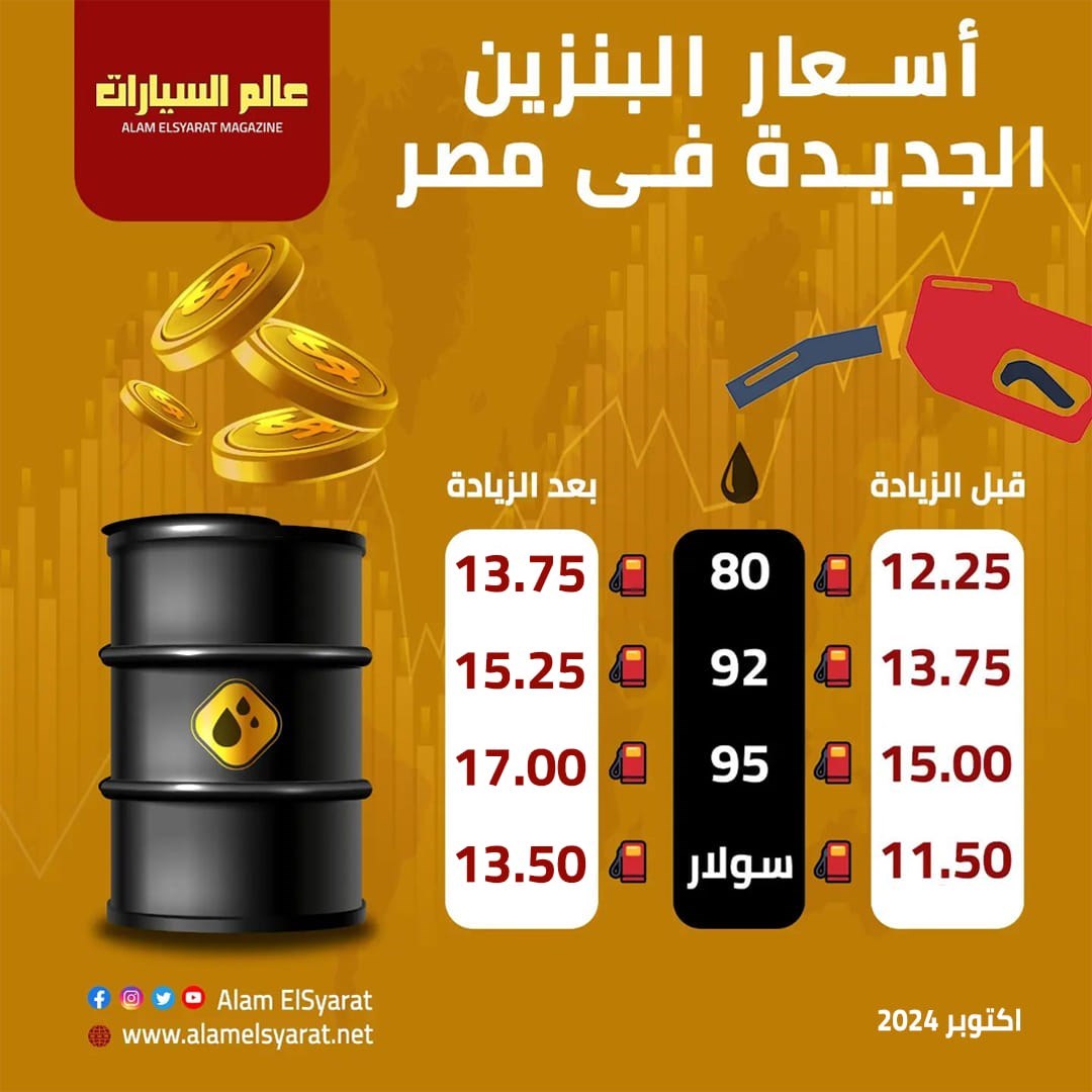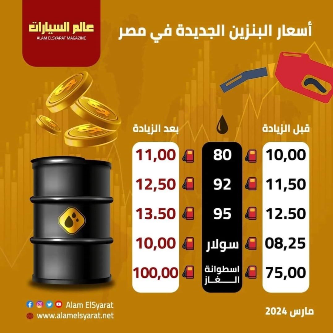 الجدير بالذكر أن لجنة التسعير التلقائي للمنتجات البترولية كانت قد أعلنت خلال شهر أبريل الماضي عن رفع أسعار البنزين والمواد البترولية، حيث ارتفع سعر لتر بنزين (95) من 17 إلى 19 جنيه، وسعر بنزين (92) من 15.25 إلى 17.25 جنيه، بنزين (80) من 13.75 إلى 15.75 جنيه.. أما السولار فارتفع من 13.50 إلى 15.50 جنيه للتر.