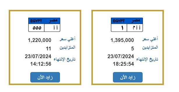 كما يجري التزايد على لوحة تحمل رقم (أ أ م 1) من قبل 5 متزايدين بسعر بلغ مليون و395 ألف جنيه، وينتهي تاريخ المزايدة اليوم حتى الساعة السادسة و25 دقيقة مساءً.