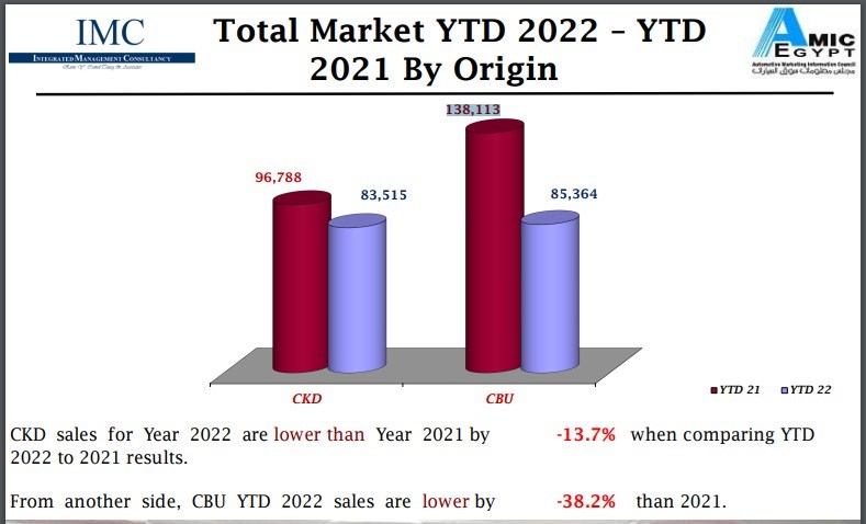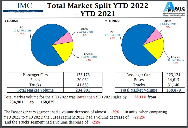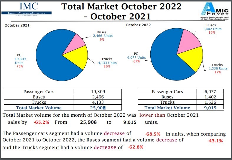 وأظهر تقرير أميك التراجع الحاد في إجمالي مبيعات الفئات الثلاثة معا (الملاكي والحافلات والشاحنات) والذي وصلت نسبته إلى 28%، حيث تم تسجيل 168,879 سيارة منذ بداية العام الحالي وحتى أكتوبر، مقابل 234,901 سيارة خلال نفس الفترة العام الماضي.