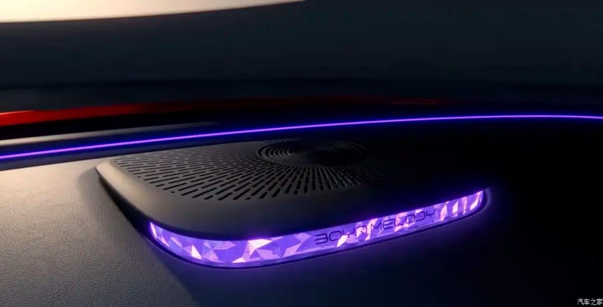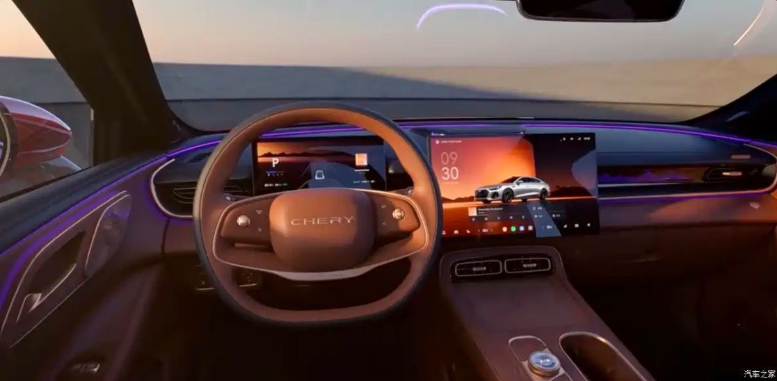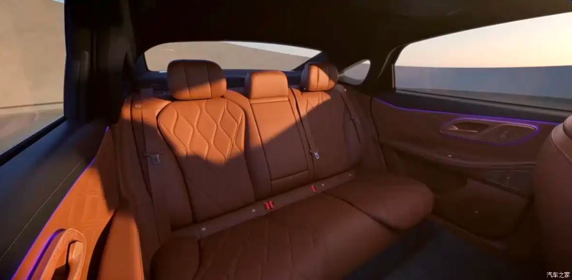 داخل المقصورة يظهر تصميمها الملتف ليحيط بالجالسين، مع إضاءة محيطة وتطعيمات من الكروم والخشب لإضفاء طابع الفخامة. وتظهر عجلة القيادة بذراعين وخلفها شاشة كبيرة رقمية للعدادات، بجوارها شاشة أكبر للترفيه وعرض البيانات تطفو أعلى الكونسول الوسطي.