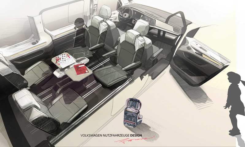 ولأول مرة على الإطلاق، سيتميز طراز Multivan الجديد بمقاعد فردية للصف الثالث أيضًا، بجانب طاولة موضوعة على نظام مسار يتيح للمستخدمين تحريكها للأمام والخلف، كما يمكن تدوير مقاعد الصف الثاني 180 درجة لإنشاء تصميم جلوس وجهًا لوجه، في حين يمكن إزالة المقاعد الأخف في الصف الثاني والثالث تمامًا لإنشاء منطقة تحميل واسعة.