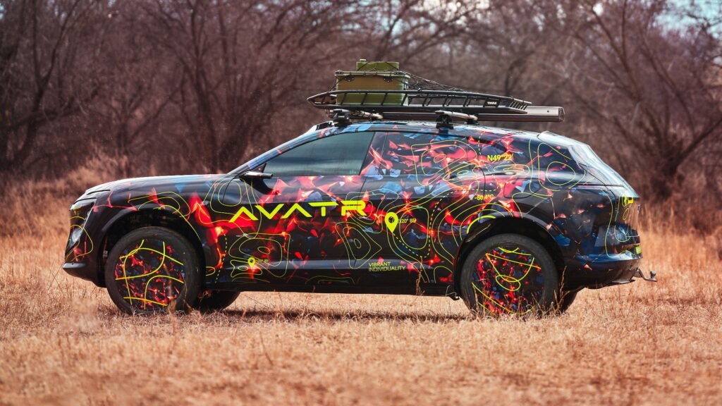 من الجوانب تستقر كاميرات في موضع مرايا الأبواب، وتأتي مقابض الأبواب قابلة للسحب، وتظهر عوارض تحميل فوق السقف، ويقدر طولها الكلي بحوالي 4,750 مم، كما يظهر الخلوص الأرضي مرتفعًا ليدل على طبيعة مهامها، ومن خلال الصور تبدو العجلات مقاس 22 بوصة.. أما من الخلف فيتشابه تصميم المصابيح مع "أفاتار 12" من حيث انسيابية الشكل، وفي الأسفل يستقر ذراع للجر عند المصد الخلفي. ولم تبين الصور المعلنة ما إذا كانت السيارة الجديدة ستكون بلا زجاج خلفي كما في شقيقتها 12، وكذلك احتوائها على شاشة تفاعلية مع المشاة تستقر بين الزجاج الأمامي وغطاء المحرك.