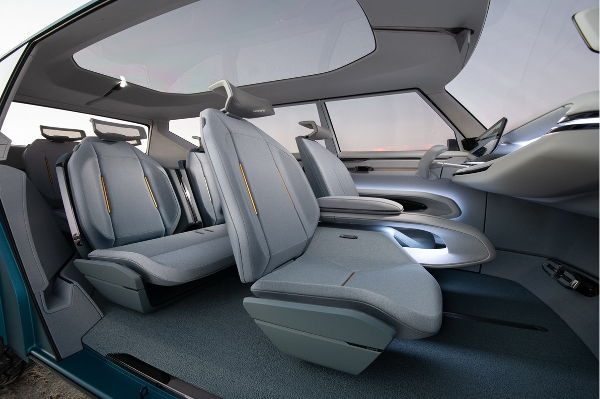 في الداخل، يتميز مفهوم EV9 بأجواء رائعة تشبه المنزل مع خيارات جلوس مرنة.. مع التصميم المستقبلي والإضاءة المحيطة ومجموعة الأدوات الرقمية كالشاشة التي تأت بمقاس 27 بوصة بالإضافة إلى مركز المعلومات والترفيه.