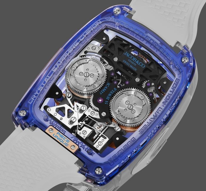 تشتمل الساعة أيضًا على "نظام الحماية من الصدمات" من Jacob & Co ، ولمسات من الذهب الوردي عيار 18 قيراطًا ، وحزام مطاطي ، وإبزيم من الذهب الوردي عيار 18 قيراطًا. تم إنشاء وحدة واحدة فقط واستغرق الأمر حرفيًا واحدًا حوالي 120 ساعة لإكمال العلبة بمفردها، وهي معروضة بسعر 1.5 مليون دولار.